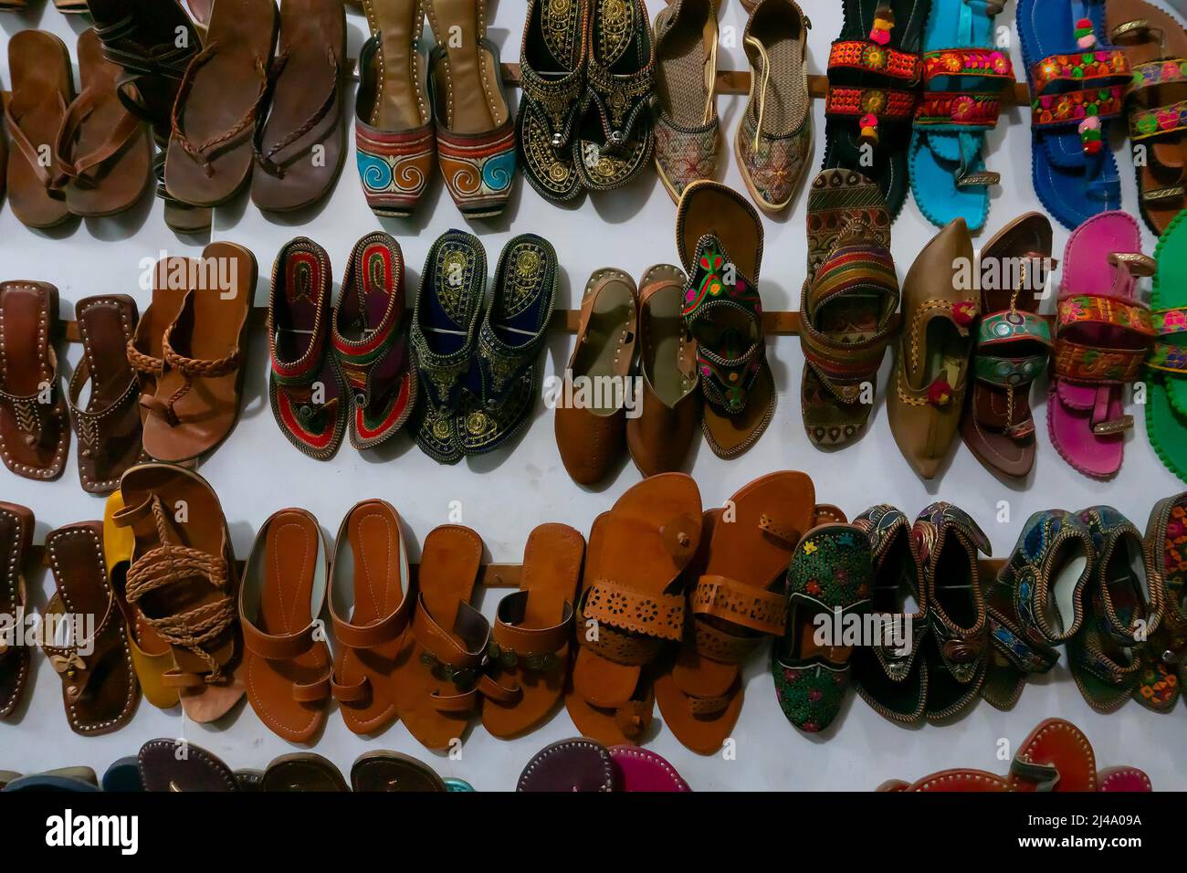 Pairs of Rajasthani colorful mens' and womens' shoes at display for sale. Jaisalmer, Rajasthan rajasthani ladies shoes