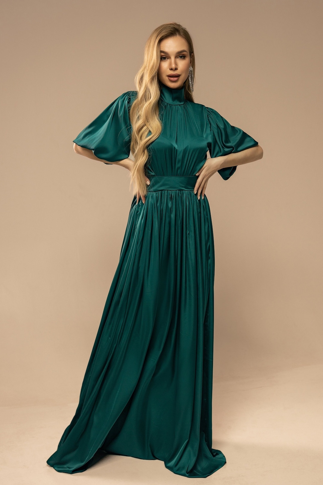 Dark Emerald Green Silk Maxi Dress High Neck, Bridesmaid Turtleneck Dress, Wedding Guest Dress gish green romance floral print tie neck silk dress