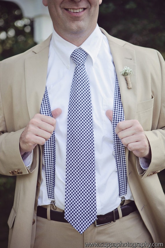 Men's Necktie and Suspenders in Navy Blue Gingham necktie and suspenders