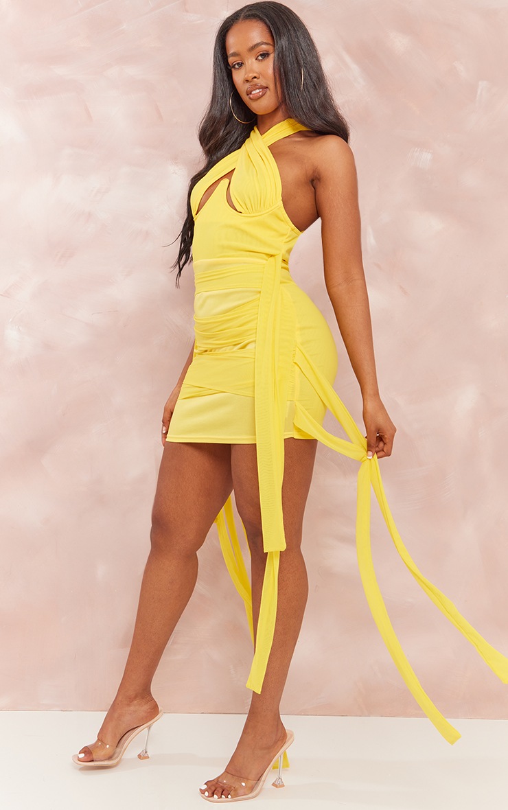 Shape Yellow Mesh Wrap Neck Tie Detail Bodycon Dress | PrettyLittleThing IE mesh wrap neck tie detail bodycon dress