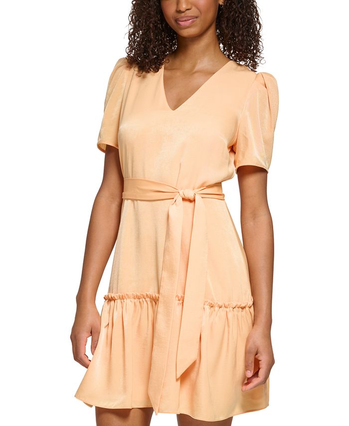 KARL LAGERFELD PARIS Women's Belted Ruffled-Hem A-Line Dress - Macy's ruffled neck tie