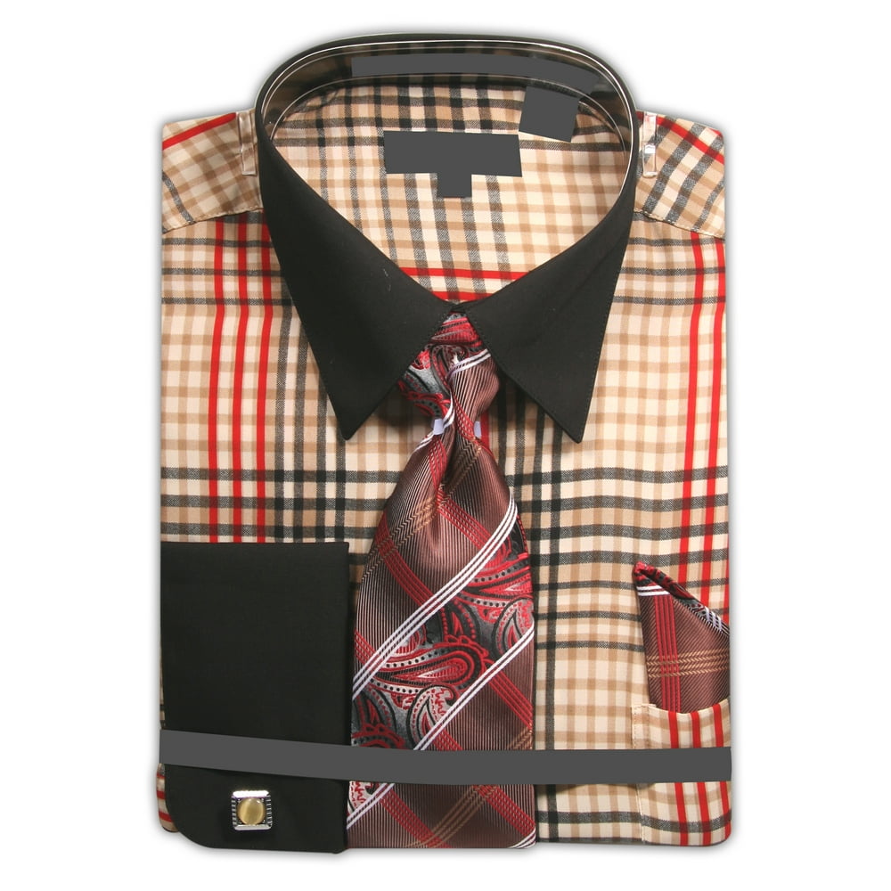 Sunrise Outlet - Men's Plaid Red Stripe Check Dress Shirt with French Cuffs and Neck Tie mens red dress shirt with tie