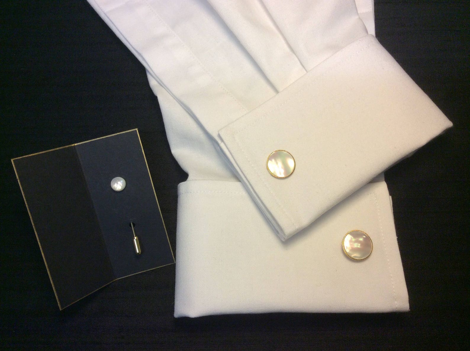 mother of pearl cufflinks and tie pin