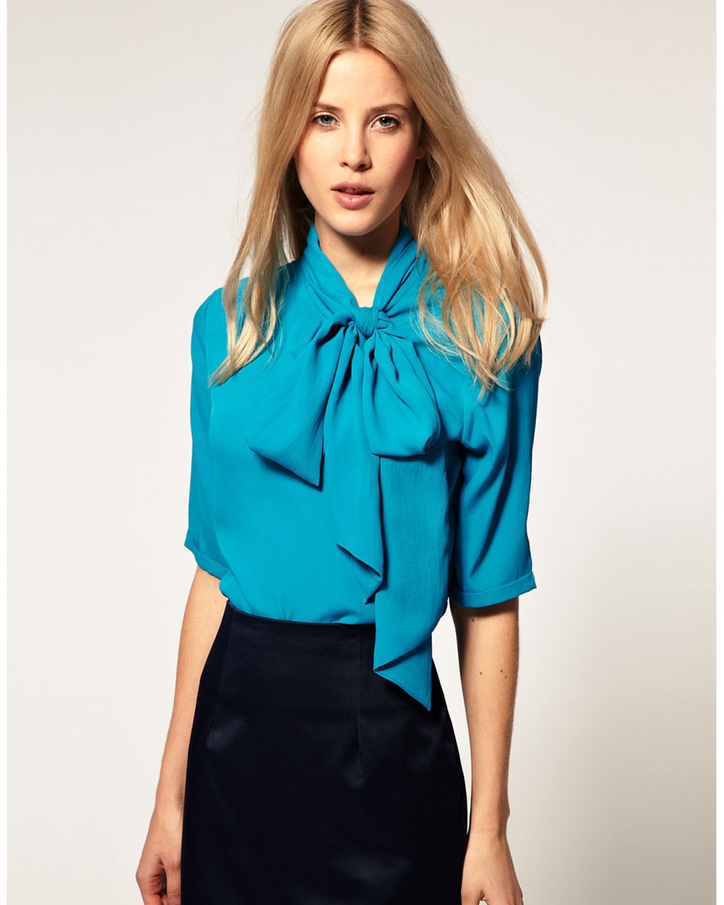 ASOS Collection Blouse with Side Tie Pussybow in Blue | Lyst pussybow tie blouse