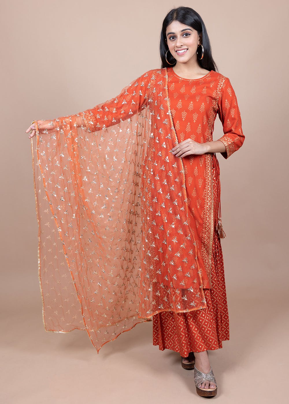 Get Rust Orange Gold Printed Straight Kurti With Side Tie-Ups Paired With Sharara And Dupatta at kurti with side tie up