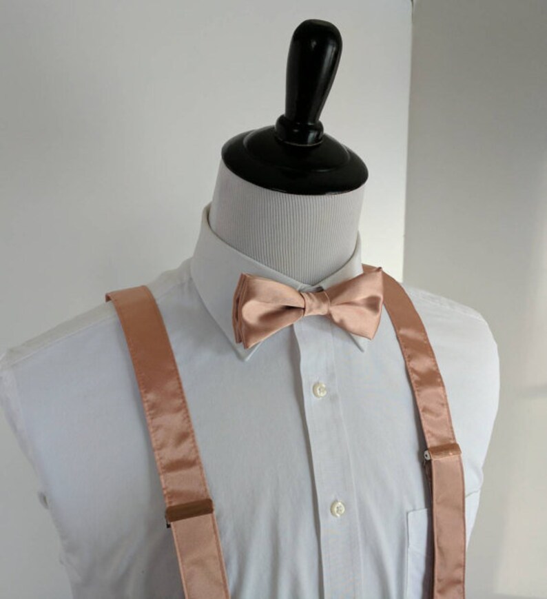 Rose Gold Satin Bow Tie, Mens Bow Tie, Wedding Bow Tie, Grooms, Groomsmen Bow Tie, Ring Bearer mens rose gold bow tie and suspenders