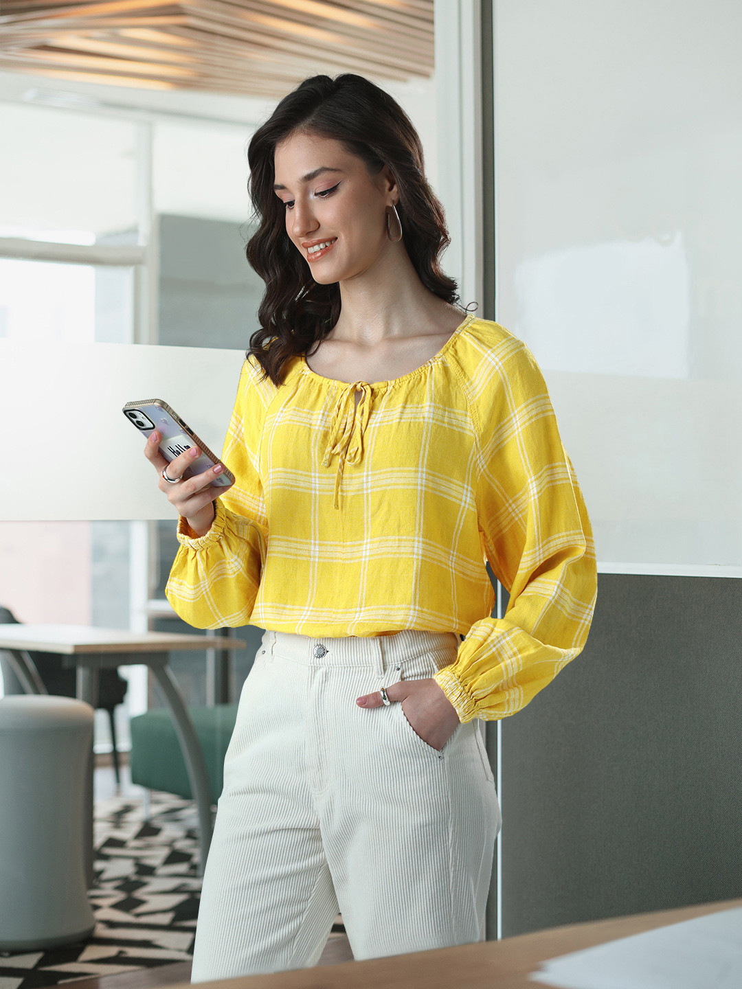 Buy Marks & Spencer Women Yellow Checked Tie Up Neck Bishop Sleeves Linen Top - Tops for Women marks and spencer tie dye top