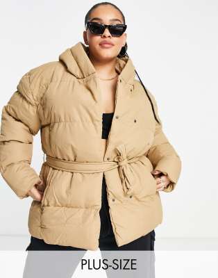 Threadbare Plus Stanley tie waist mid length puffer jacket with hood in mushroom | ASOS topshop mid length tie waist puffer jacket in mushroom