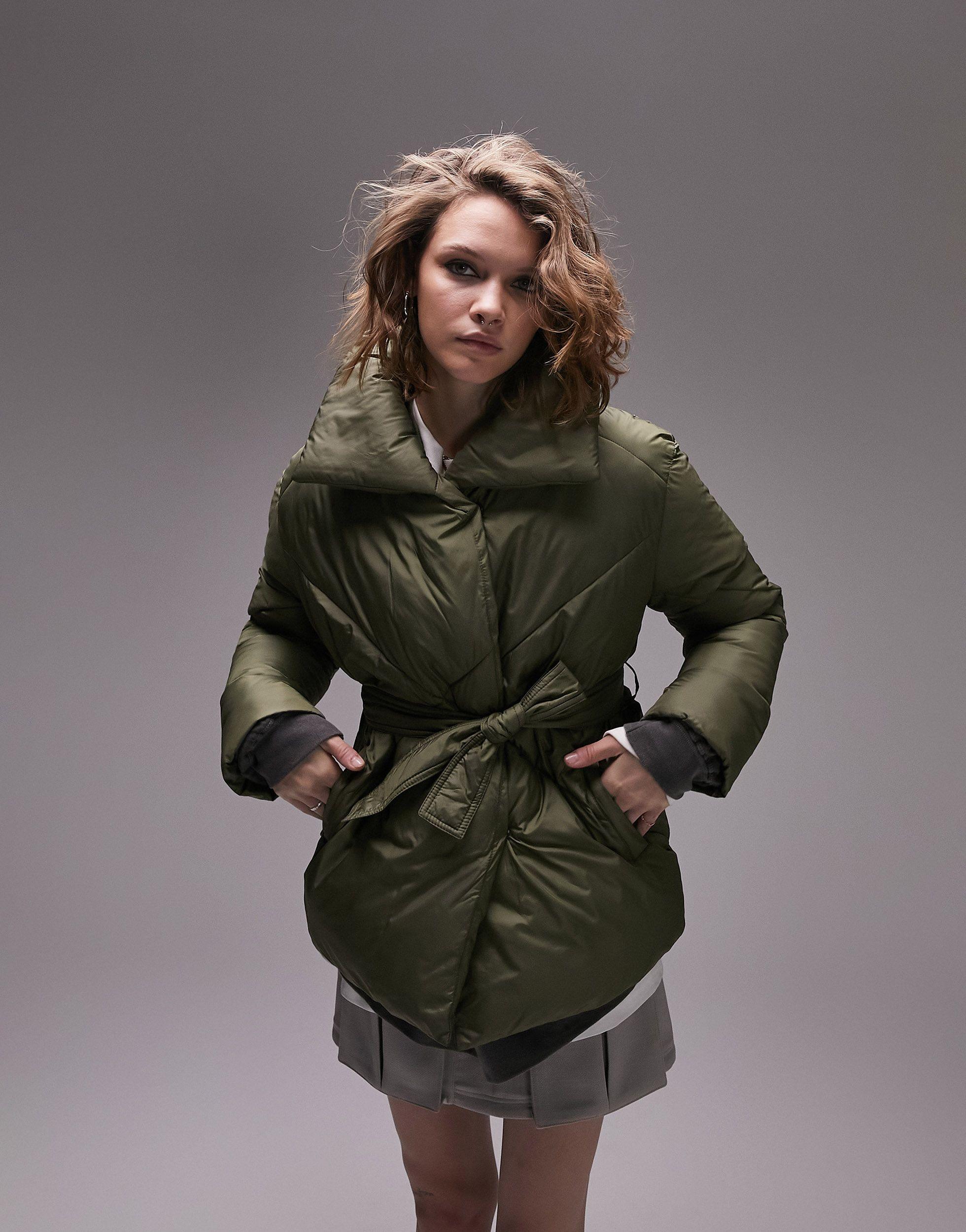 TOPSHOP Tie Waist Puffer Coat in Black | Lyst