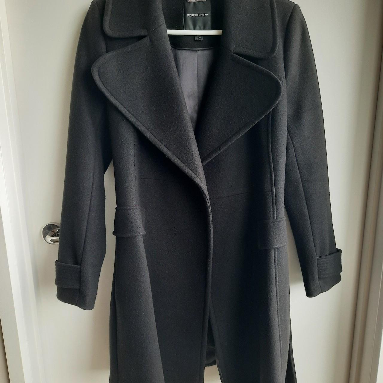 Black Coat With Faux Fur Collar & Tie Waist, Plus size 16 to 36 long black coat tie waist