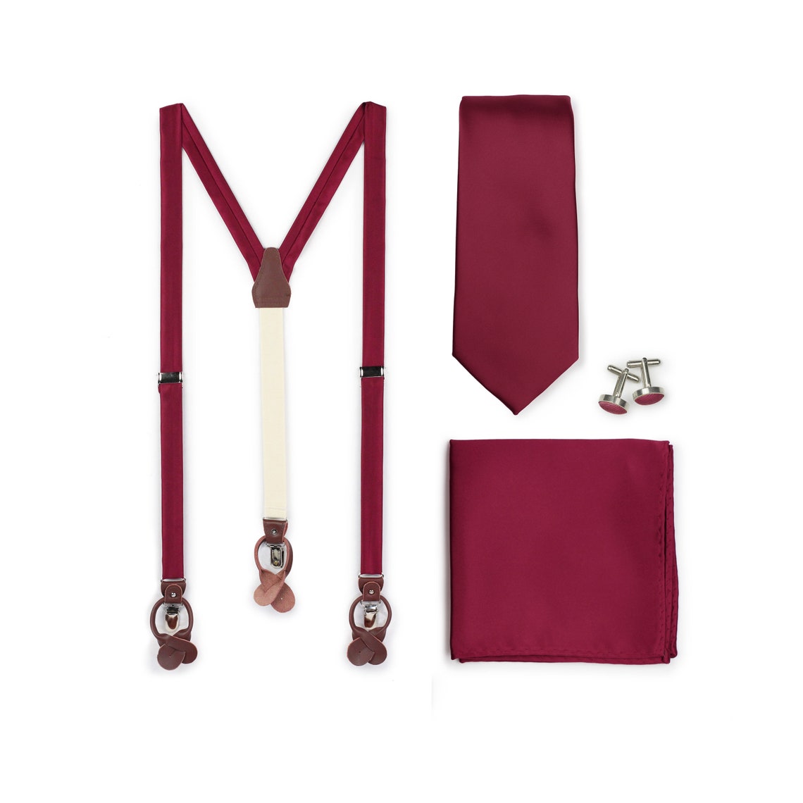 Red Suspender + Tie Set | Matching Men's Suspender, Necktie, Hanky, and Cufflinks in Bright Red    Wine Suspender Set | Claret Burgundy Formal Suspender, Necktie, Hanky Set | Mens Formal Satin