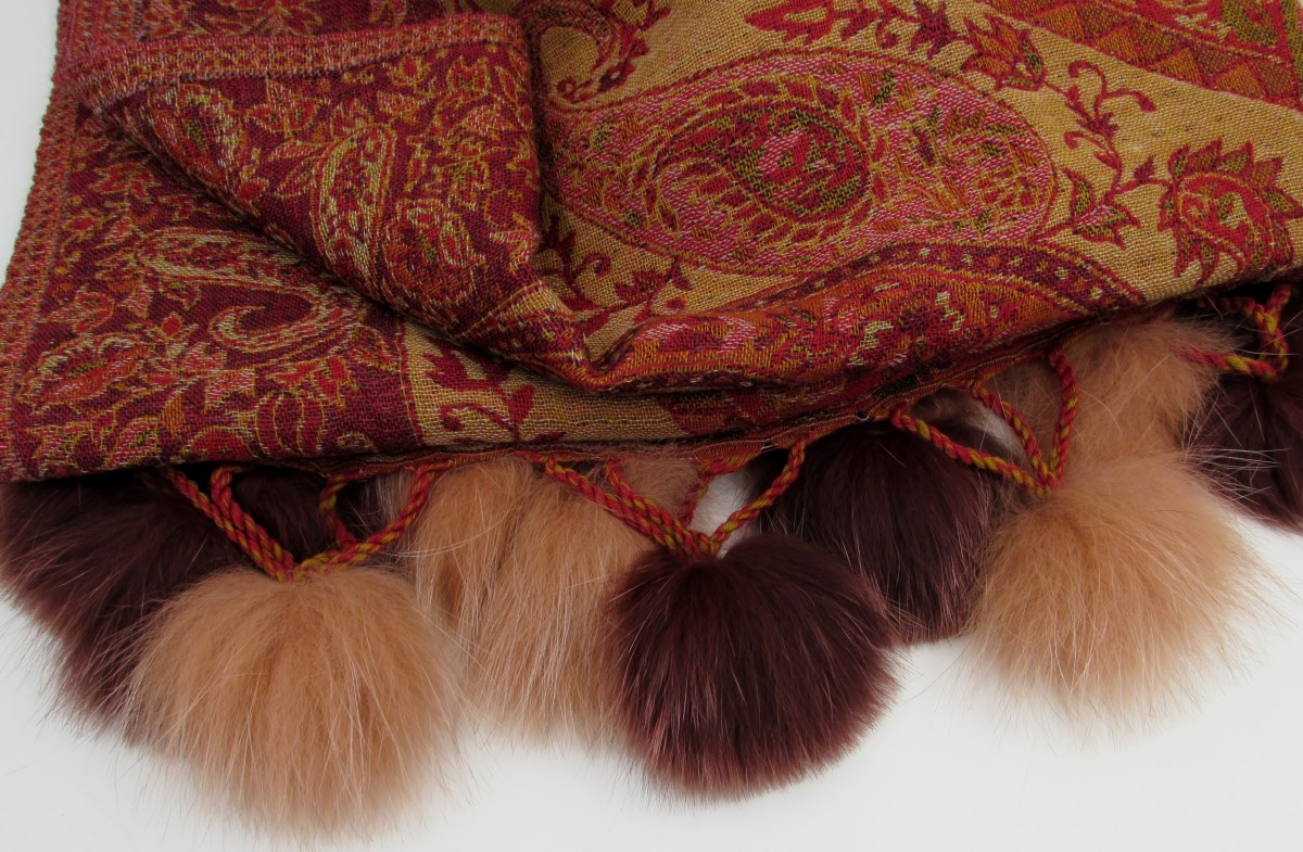 Wool Shawl with Fur Pom Poms by Pulvermacher Designs - S & K Ltd. fur pom pom shawl