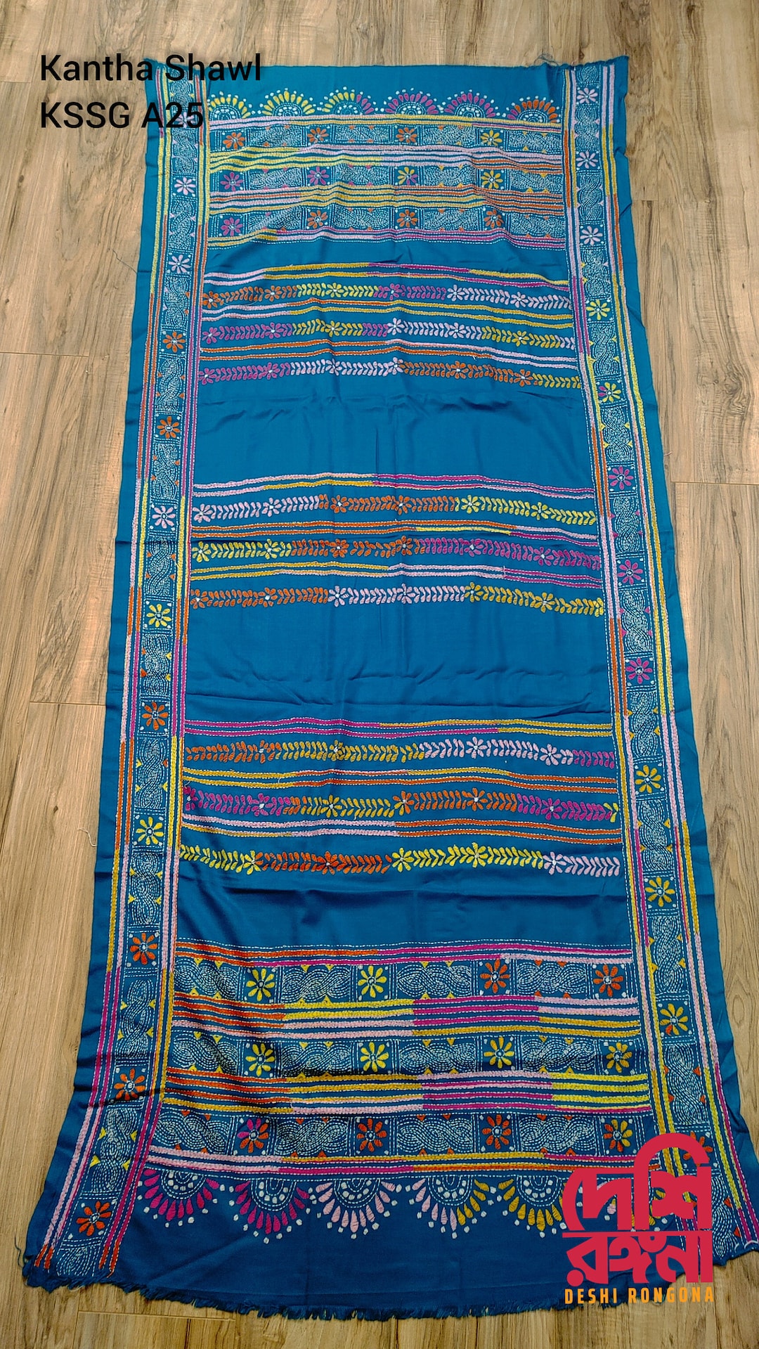 Kashmiri Shawl With Hand Kantha Stitch Work All Over, Crystal Teal, Ships From USA, Elegant kashmiri shawl hand work