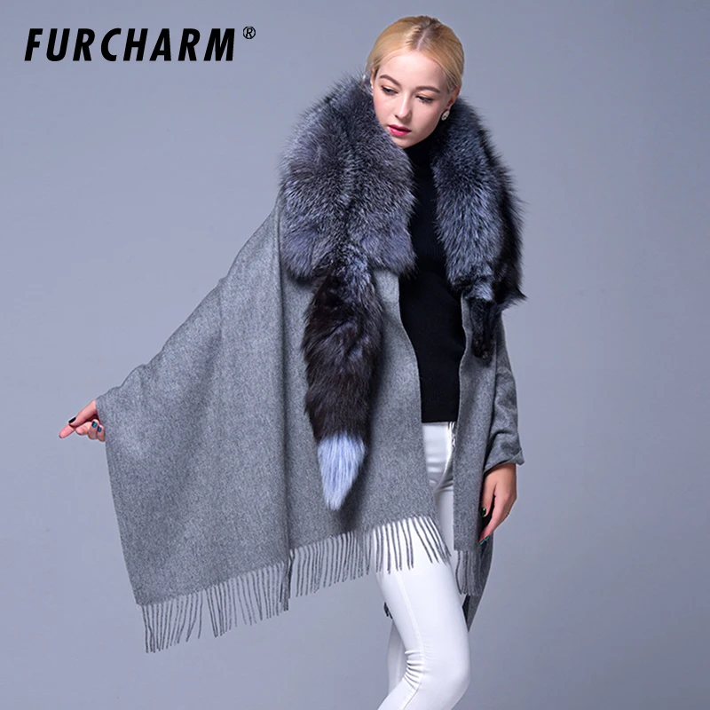Real Fur Shawls and Scarves Cashmere with Genuine Whole Piece Silver Fox Fur Shawl Classic Grey  fur shawls for women