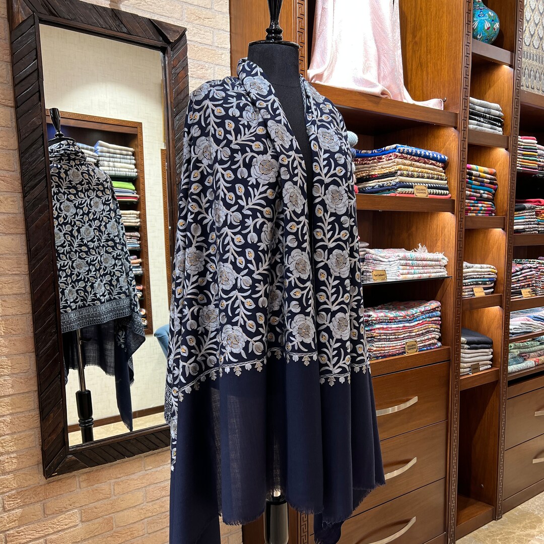 Big Size Shawl Oversized Shawl Large Navy Blue Woolen Shawl With Gold and Gray Floral Pattern oversize shawl