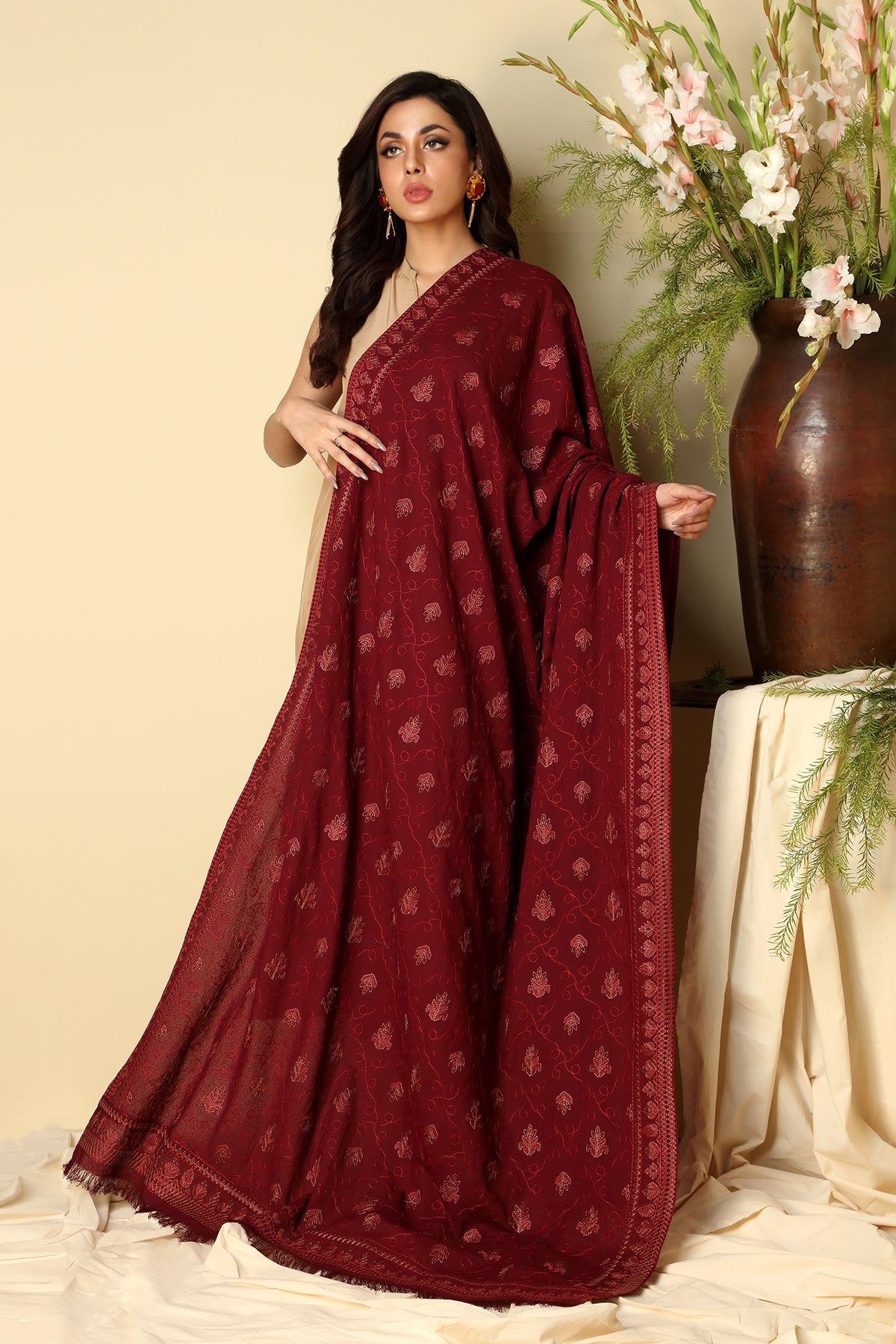 Heavy Embroidered Karandi Maroon Women's Winter Shawl Price in Pakistan (M015486) - 2023 Designs karandi embroidered shawls