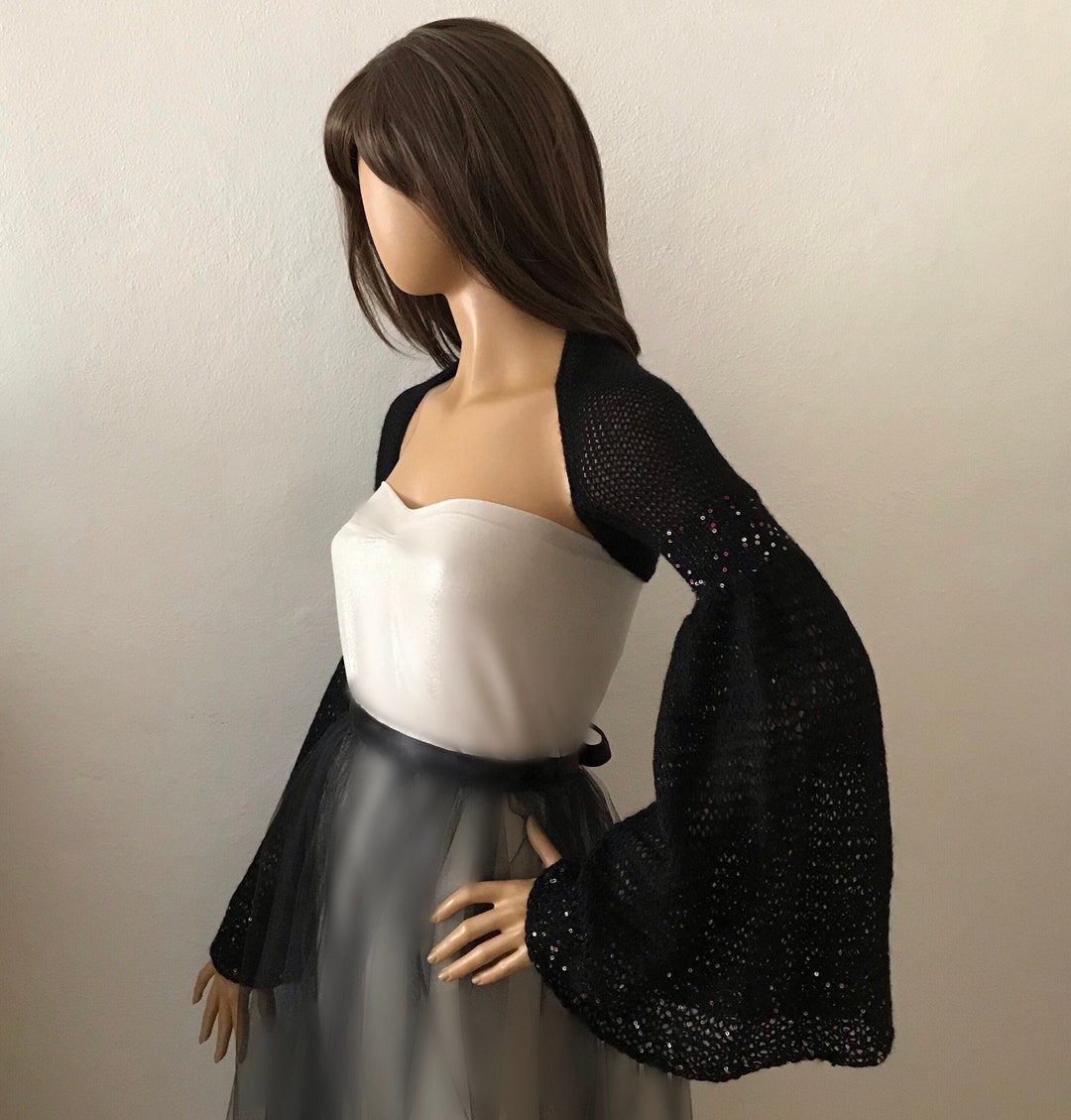 Black Shrug, Evening Shawl, Gothic Wedding Shrug, Bell Sleeve Shrug, Sequin Shrug, Bridal shrug shawl with sleeves