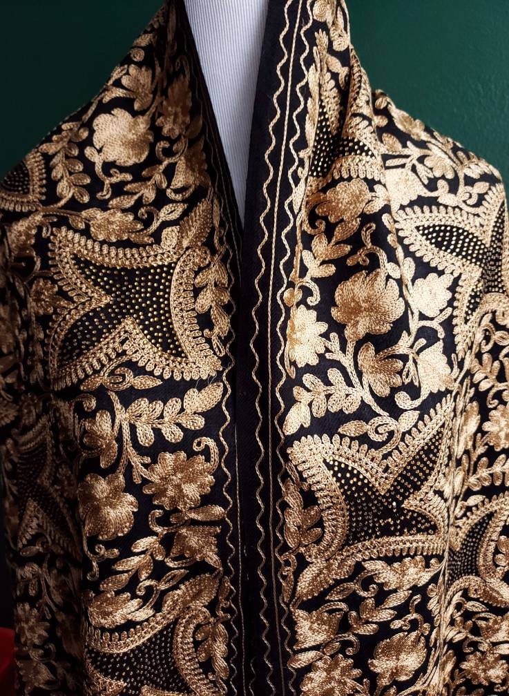 Embroidered black wool shawl with rose gold glitter, sequin shawl, formal shawl, luxury shawl jewelled shawl