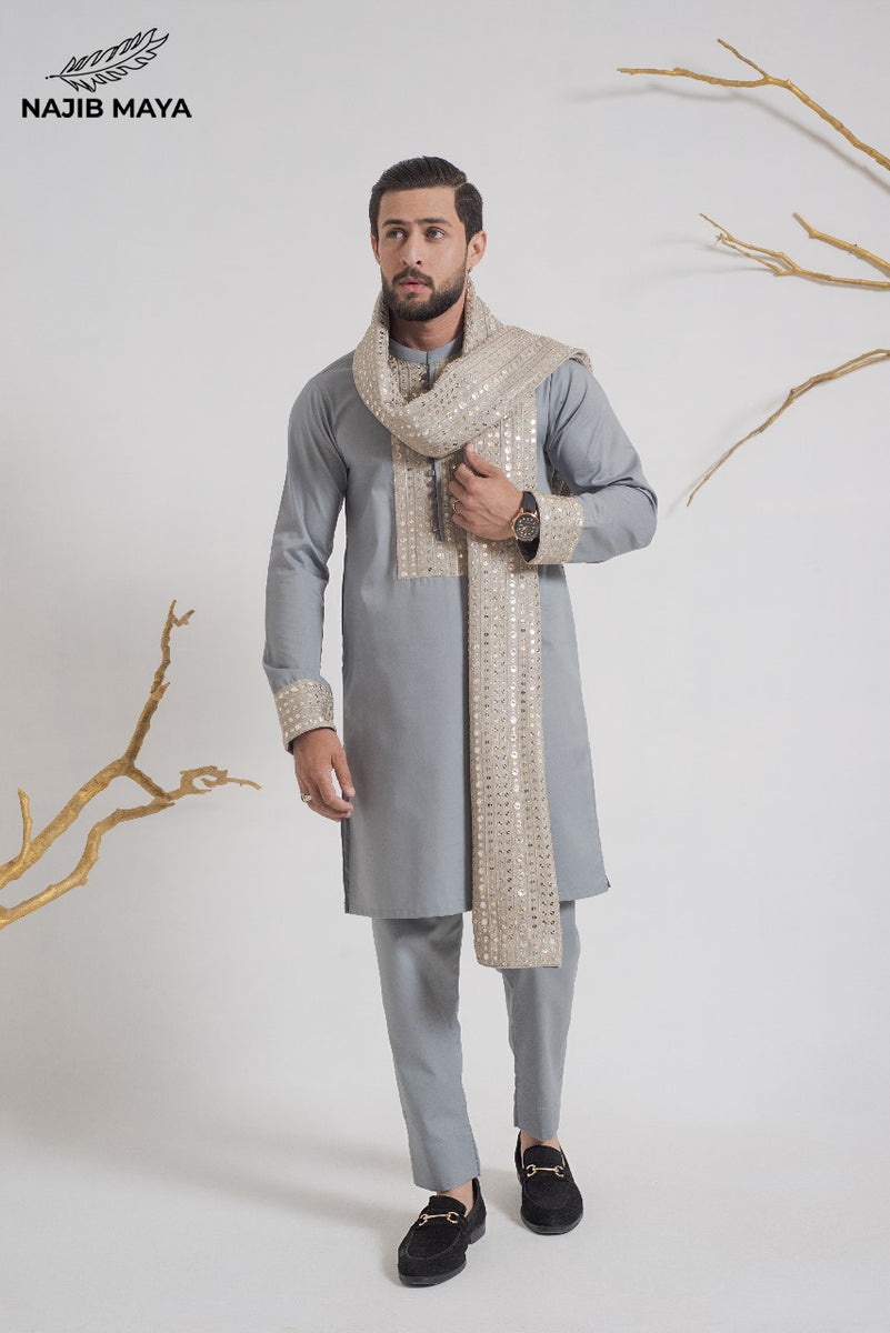 Grey Stylish Kurta Pajama + Shawl For Men's â Najib Maya mens kurta pajama with shawl punjabi style