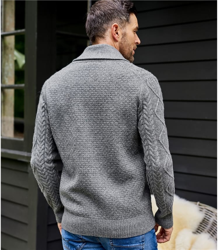 Mid Grey | Mens Lambswool Shawl Collar Cable Cardi | WoolOvers UK shawl collar mens