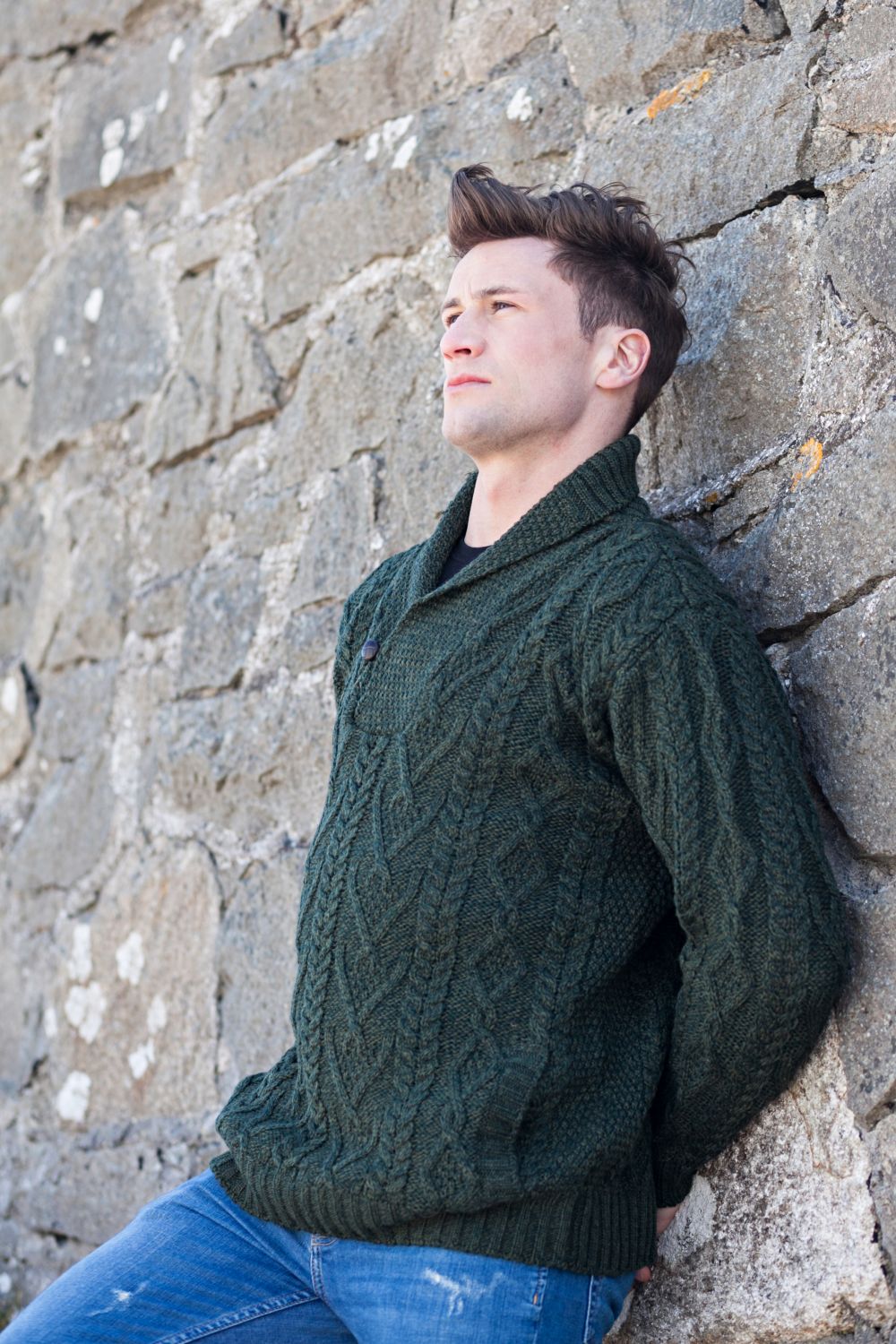 Men's Aran Shawl Neck Merino Wool Sweater | The Sweater Shop aran shawl neck fisherman sweater