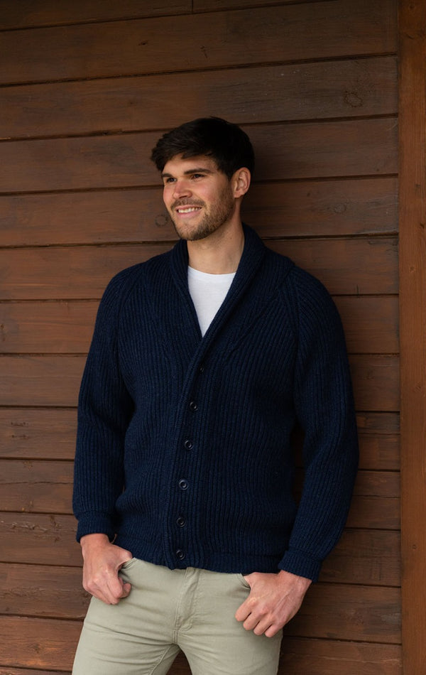 Mens warm Shawl collar ribbed wool Cardigan in a marled Navy Blue yarn â The Croft House mens ribbed shawl collar cardigan