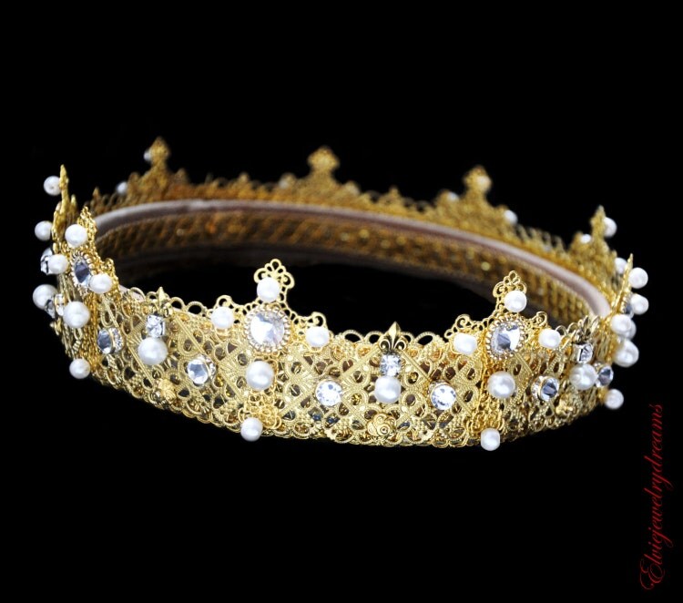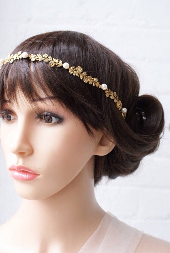 Gold Wedding Headpiece with pearls and leaves Gold Circlet headpiece with pearls