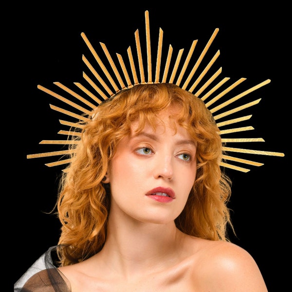 Gold Sunburst Halo Crown, Spike Headpiece, Gothic Crown, Saint Mary, Headdress, Sun Headband spiky crown headpiece