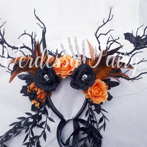 Halloween Mother Earth Branch Headpiece. Black and Orange Woodland Gothic Bat Headpiece. Forest mother earth headpiece
