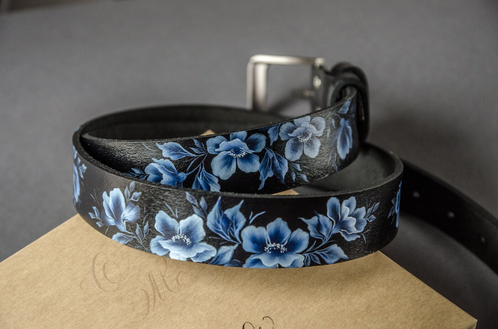 Custom black leather belt for her Tooled handpainted womens | Etsy womens tooled leather belt