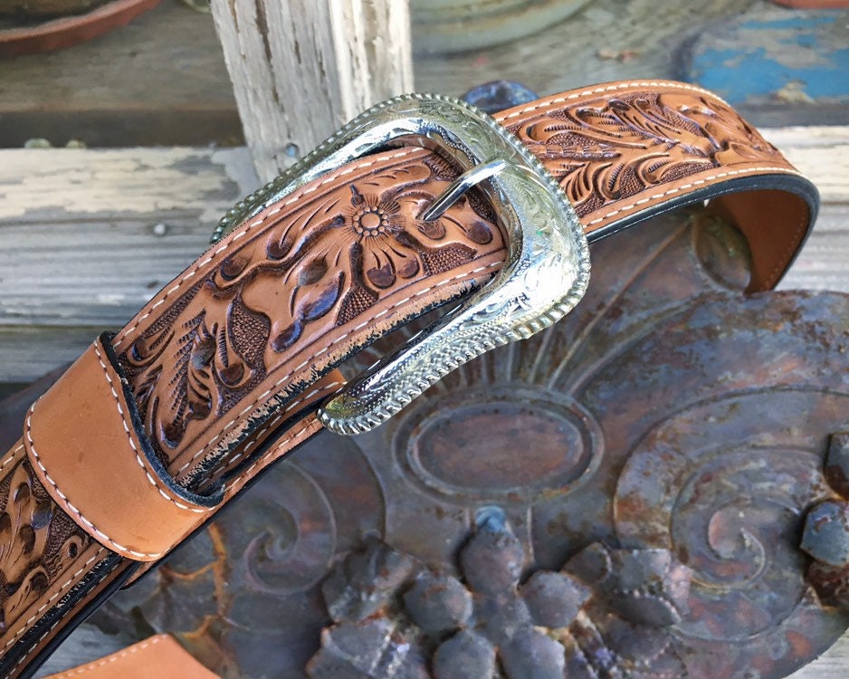Hand-tooled leather belt woman's leather belt leather womens tooled leather belt