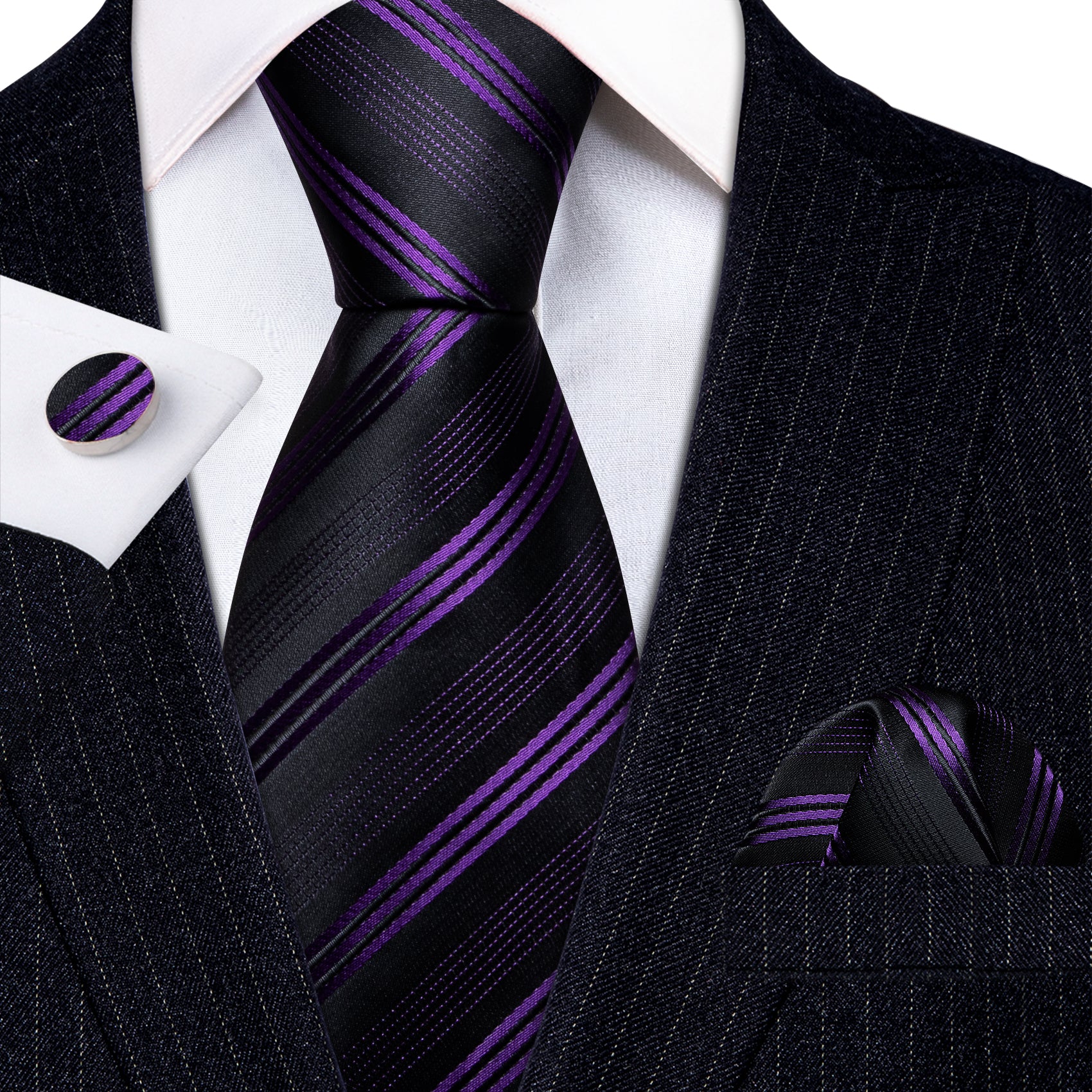 Formal Ties Enlision Men's Purple \u0026 Black Striped Tie Set - Complete With Pocket Square, Cufflinks \u0026 Handkerchief For Weddings \u0026 Formal Events Purple Black Striped Tie Wedding Set mens purple tie set