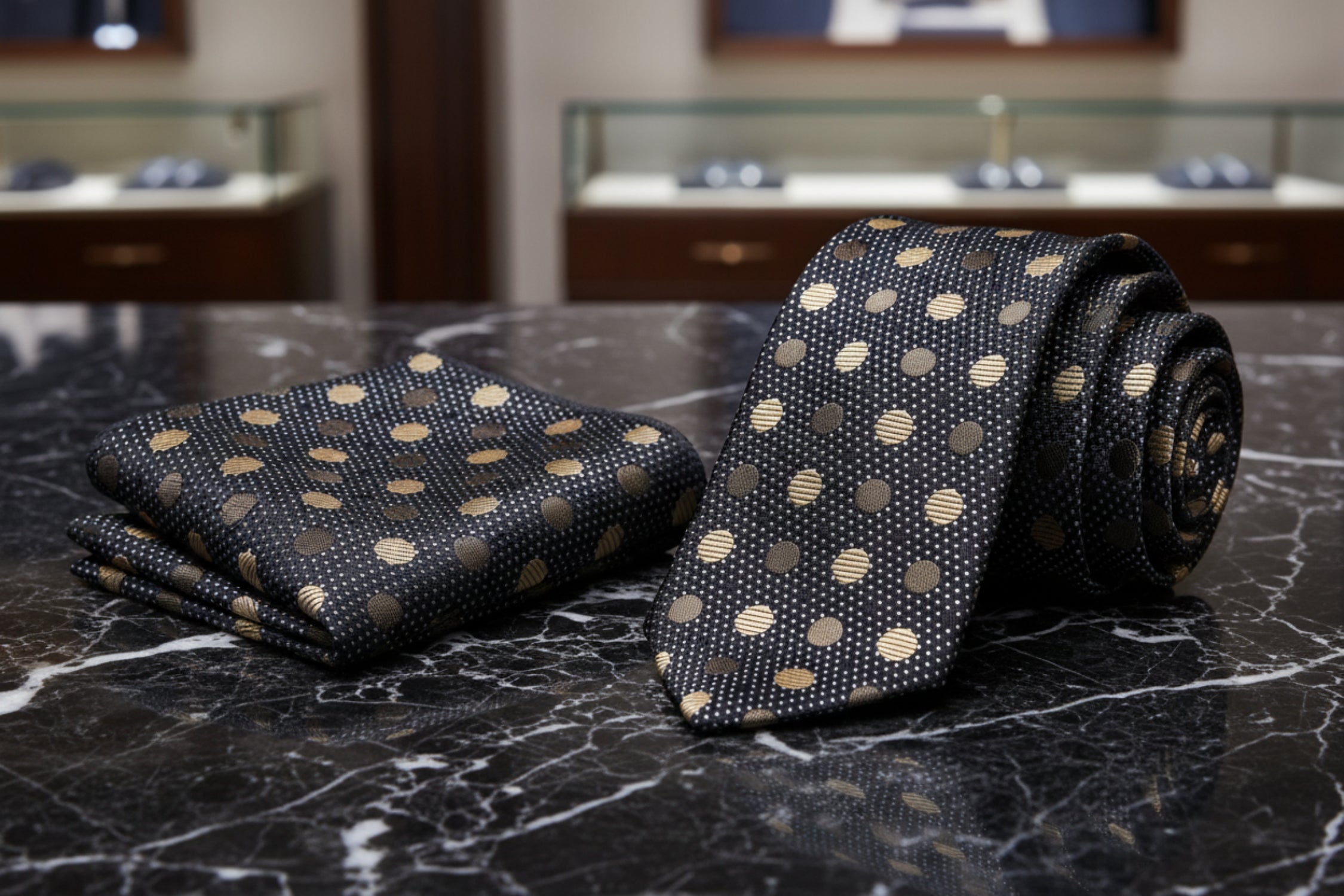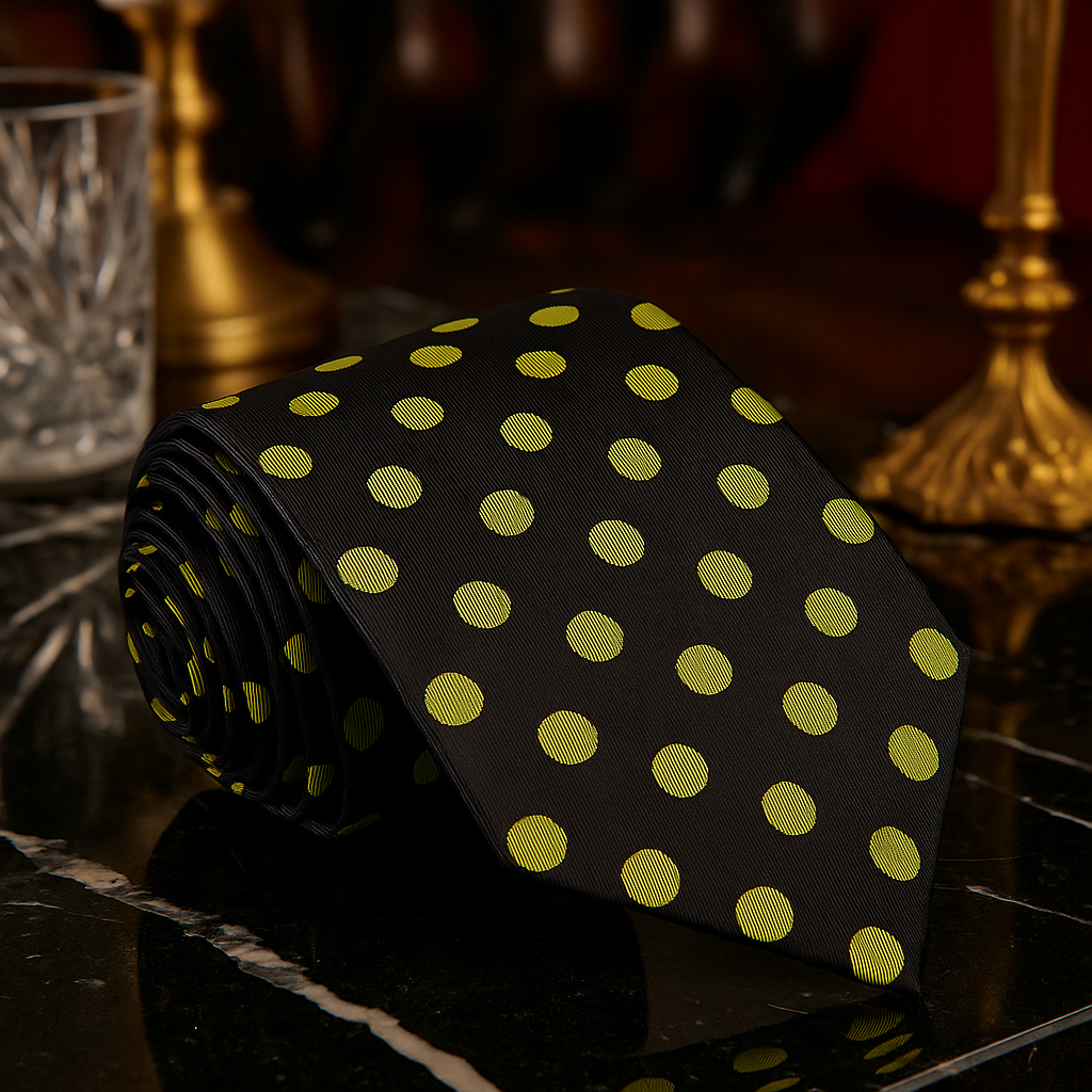 black tie with gold polka dots