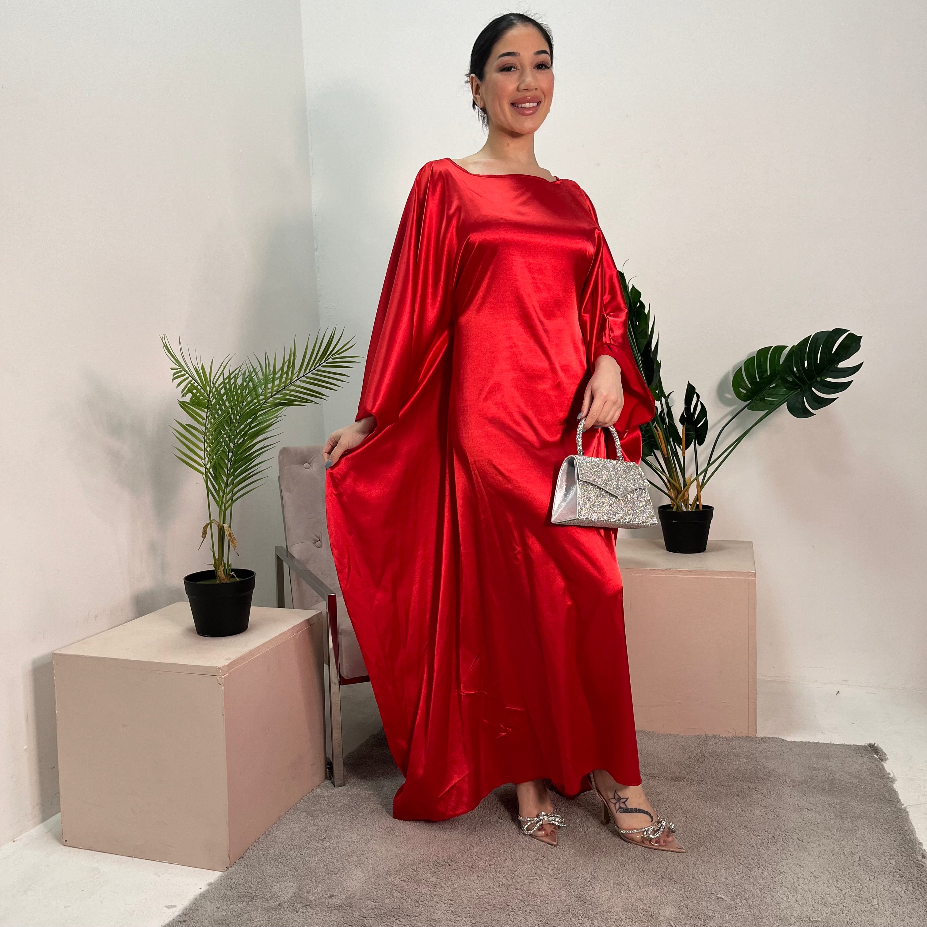 Sehr Red Quality Satin Plain Tie kaftan Dress – House Of Haniya red silk tie dress