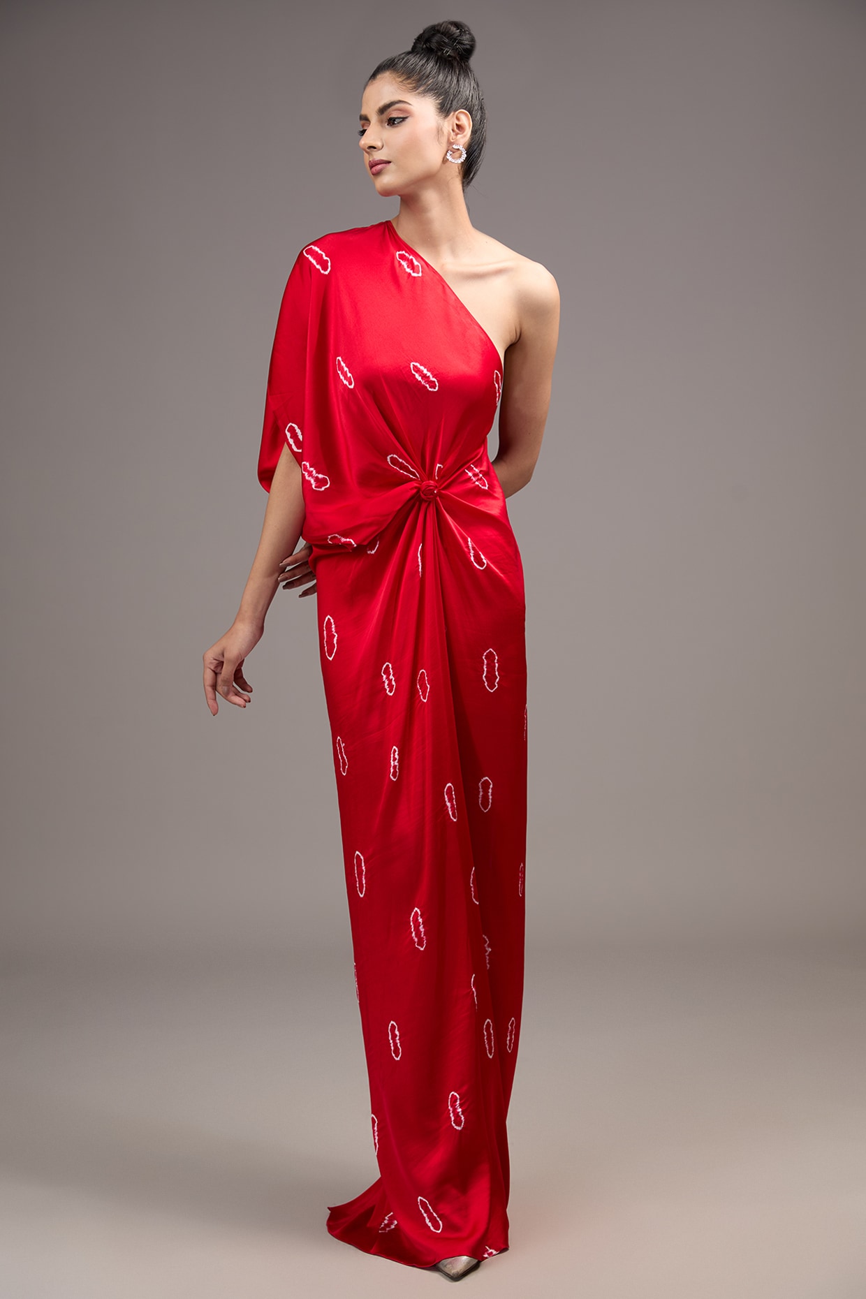 Red Silk Lycra Satin Tie-Dye One-Shoulder Dress by Stephany at Pernia's Pop Up Shop 2026 red silk tie dress