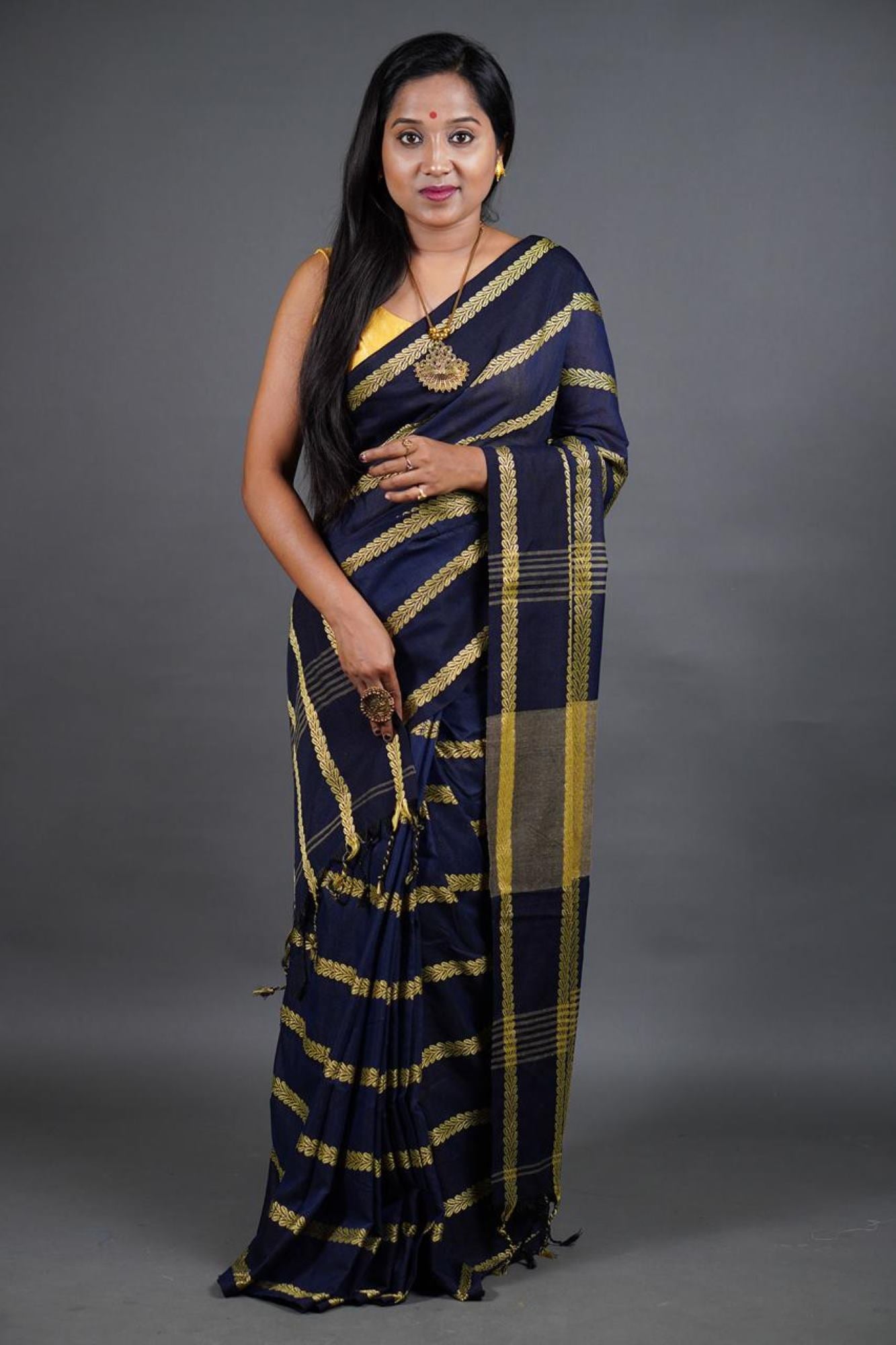 Traditional Naksha Weave Blue With Golden Thread Overall With Tassels On Pallu Pre Drape Saree | Isadora Life prestitched ready to wear one minute sarees for all sizes, customised for height. how to tie saree pallu threads