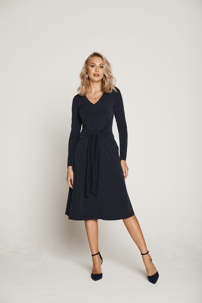 Tia Long Sleeve V Neck Dress With Tie Waist (78674) - Flair Designer Wear black long sleeve tie waist dress