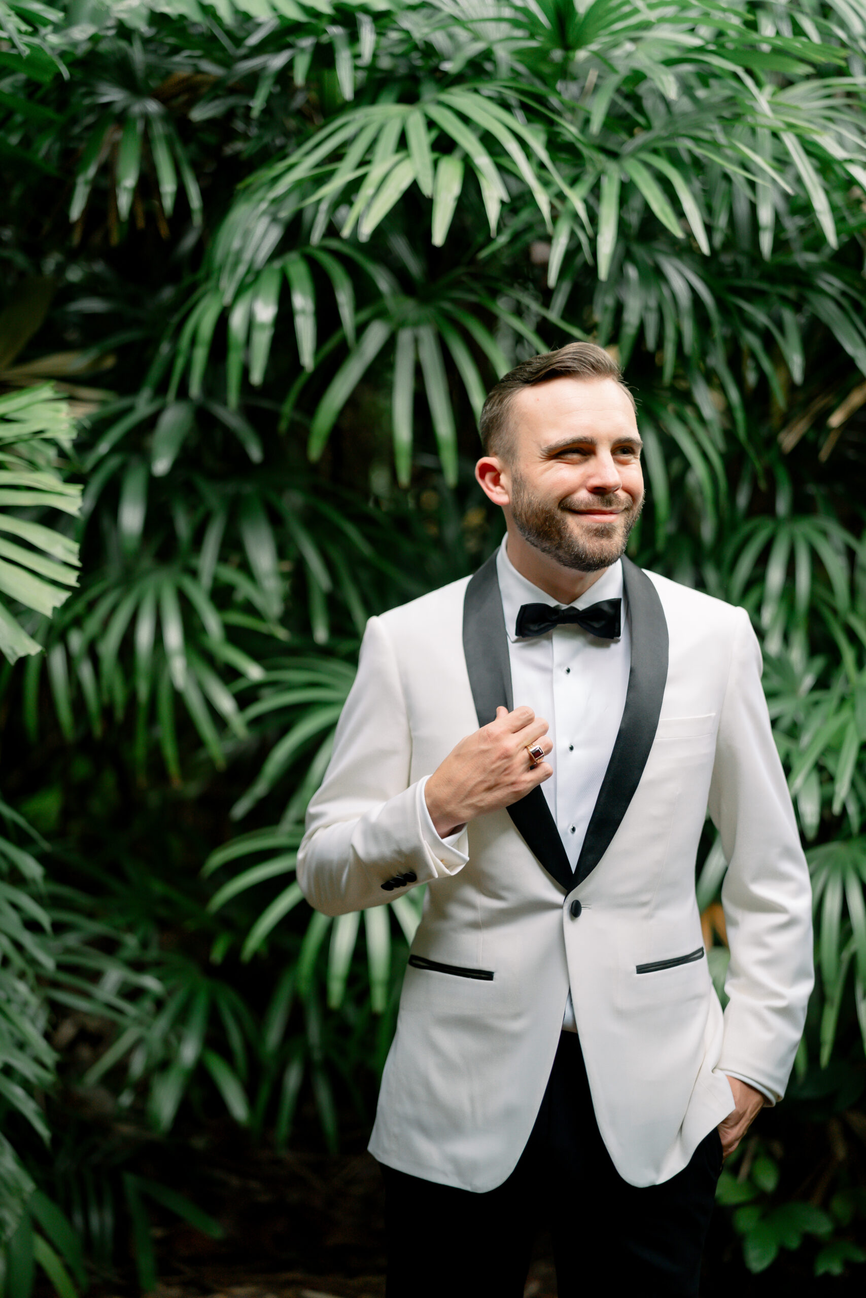A man in a white tuxedo jacket with a black lapel and a black bow tie white wedding bow tie