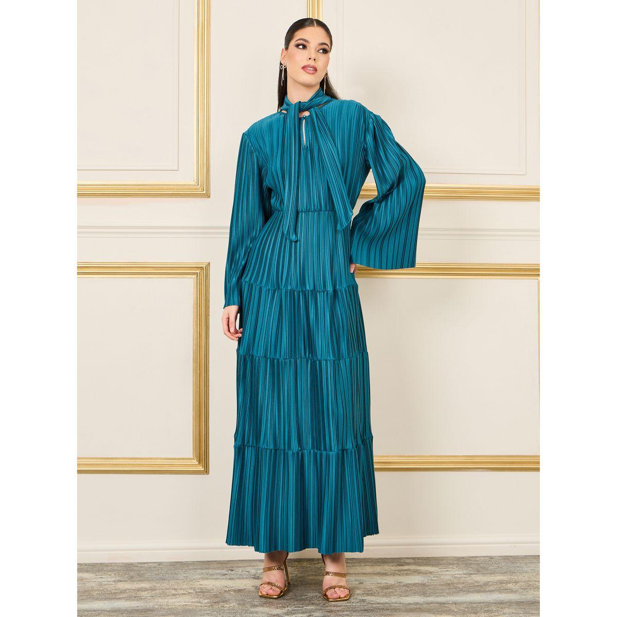 Pleated Maxi Dress Tie Neck Pleated Dress Shop Styli Limited Satin Pleated Tie Up Neck Tiered tie neck pleated dress