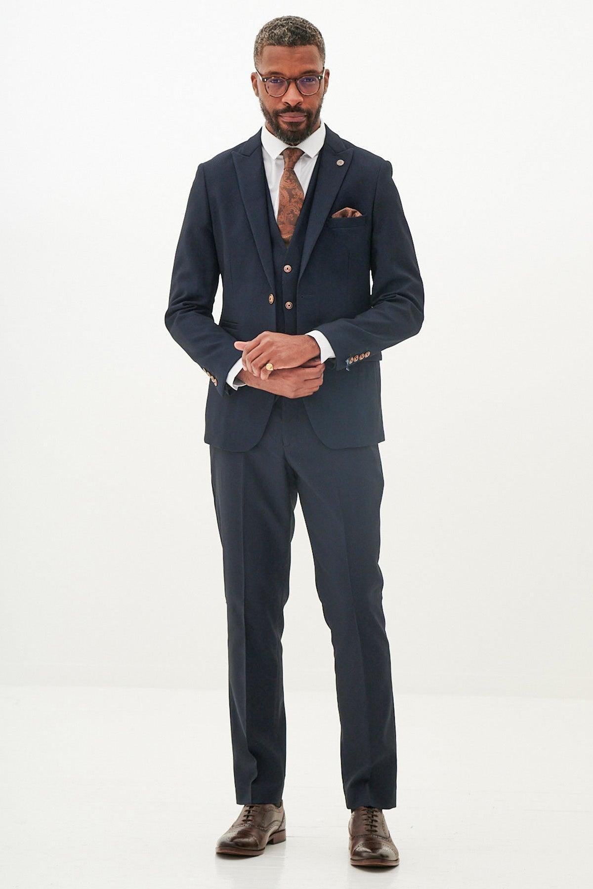MAX Navy Diamond Print Three Piece Suit – Marc Darcy short blazer with contrast ties