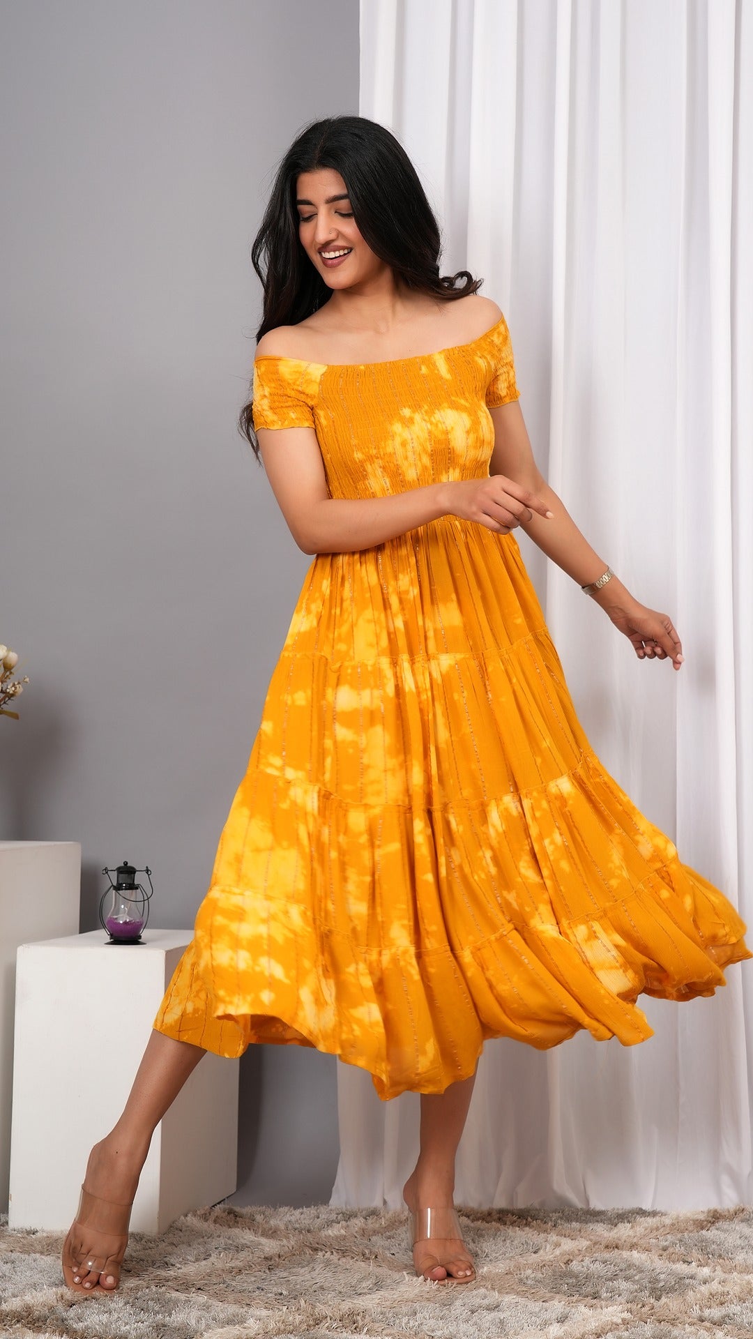 Iqraar Women Tie and Dye Dyed Smocked Off-Shoulder Fit and Flare Midi mustard co ord tie dye raffia belted mini dress