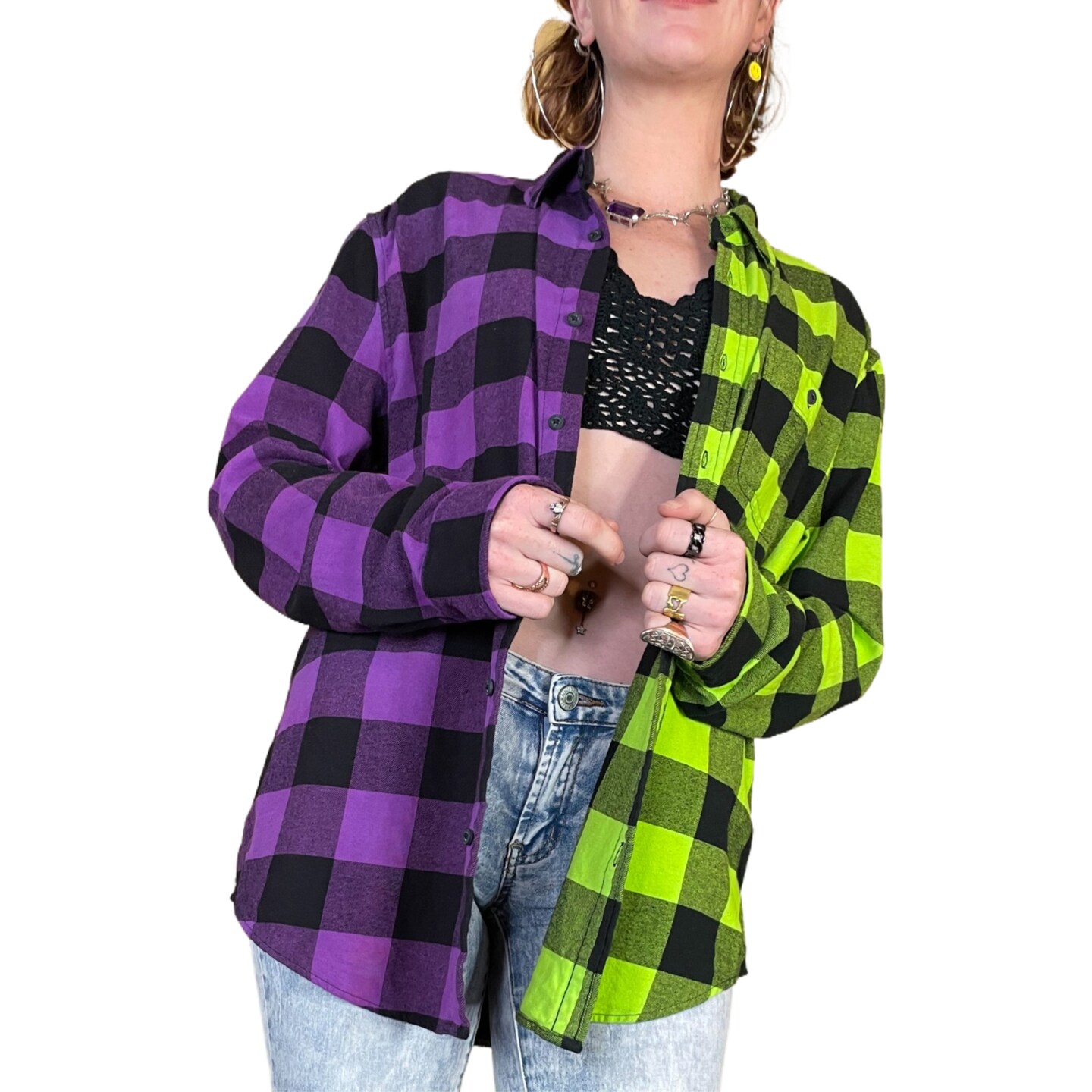 Tie Dye Purple And Neon Green Shirt Western Shirt Womens Purple Plaid Top Men's Purple And tie dye western shirt