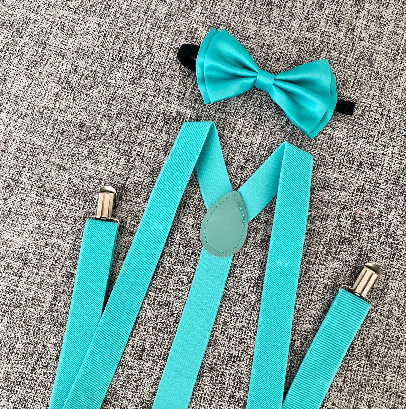Elastic Suspenders Set Teal Suspender \u0026 Bow Tie Set With Pocket Square - Pre-Tied Bow Tie With Adjustable Neck Band | Adult Formal Wear Set Adult Formal Accessories suspender tie set