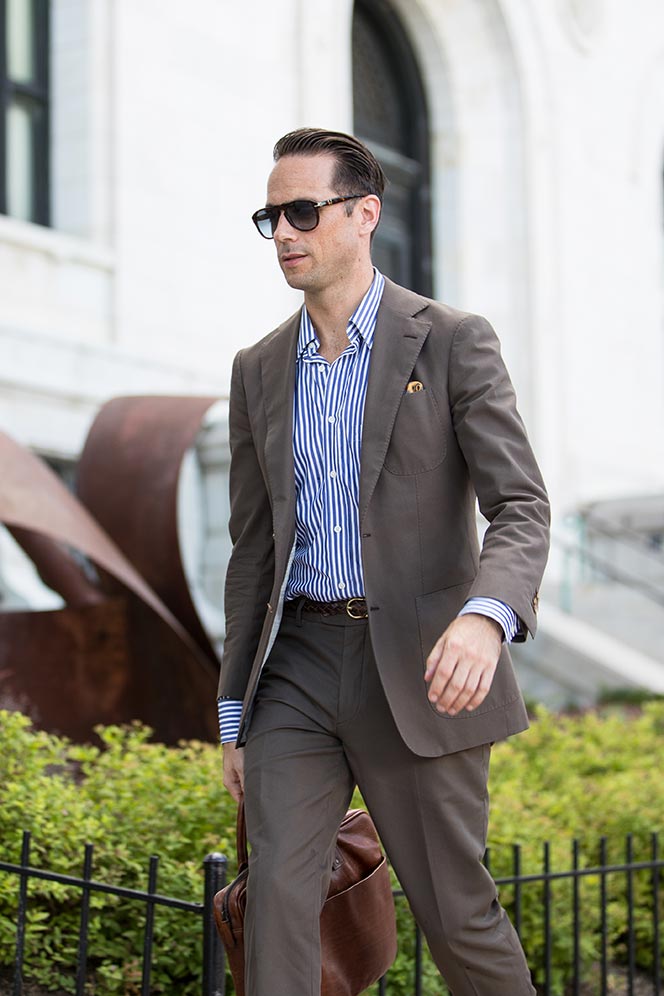 Summer Business Casual: Cotton Suit, No Tie | He Spoke Style brown suit no tie