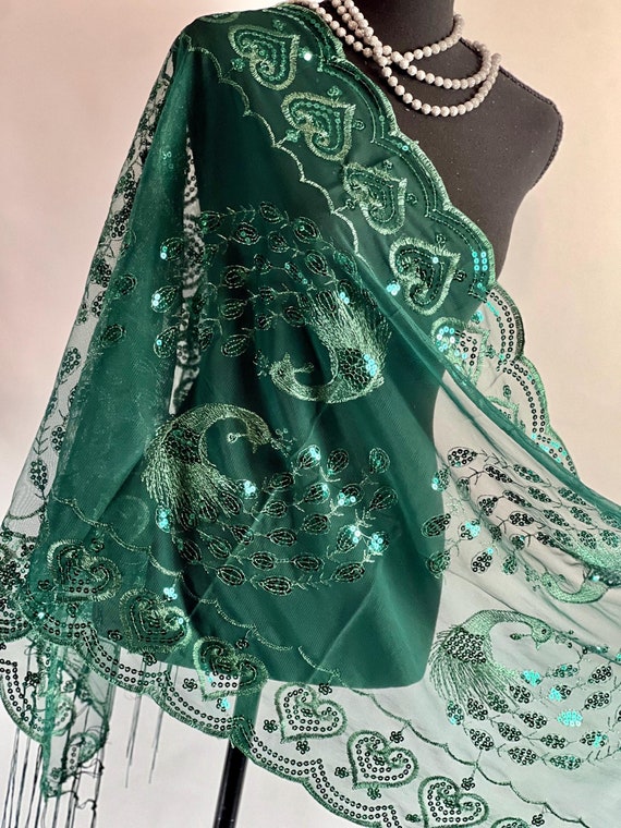 Forest Green Peacock Embroidery Sequin Scarf: Metallic Evening Shawl - Etsy peacock green shawl