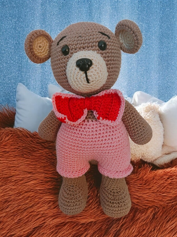 Adorable Crochet Bear With Pink Overalls and Red Bow Tie | Beautiful Handmade Stuffed Teddy Bear | Perfect Gift - Etsy crochet tie for teddy bear
