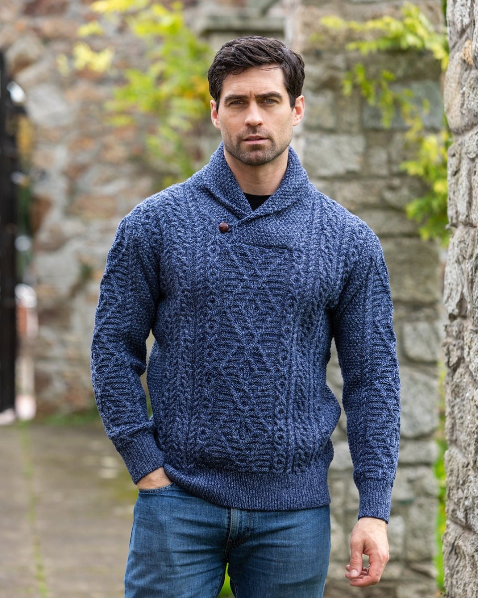 Aran Shawl Neck Sweater Deep Water Blue | The Sweater Shop sweater type shawl
