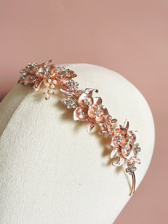 Rose Gold Side Bridal Headband, Floral Pearl Tiara, Bridal Hair Accessories, Bridal Crystal Headpiece, Wedding Flower Headband, Custom Tiara - Etsy rose gold and pearl headpiece