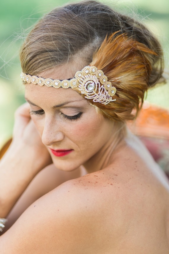 Etsy Gold Clip \u0026 Headband, The Great Gatsby Headband 1920S Flapper Feather Headpiece Gold, Champagne Rhinestone
