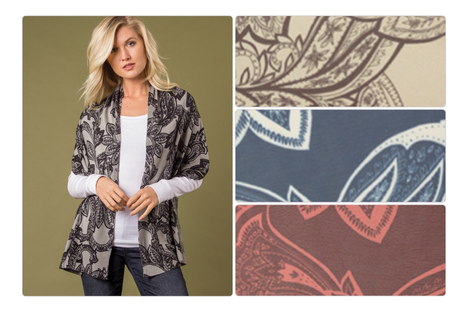 Simply Noelle button wrap shawl leaf print blue, tan, black gray button wrap shawl